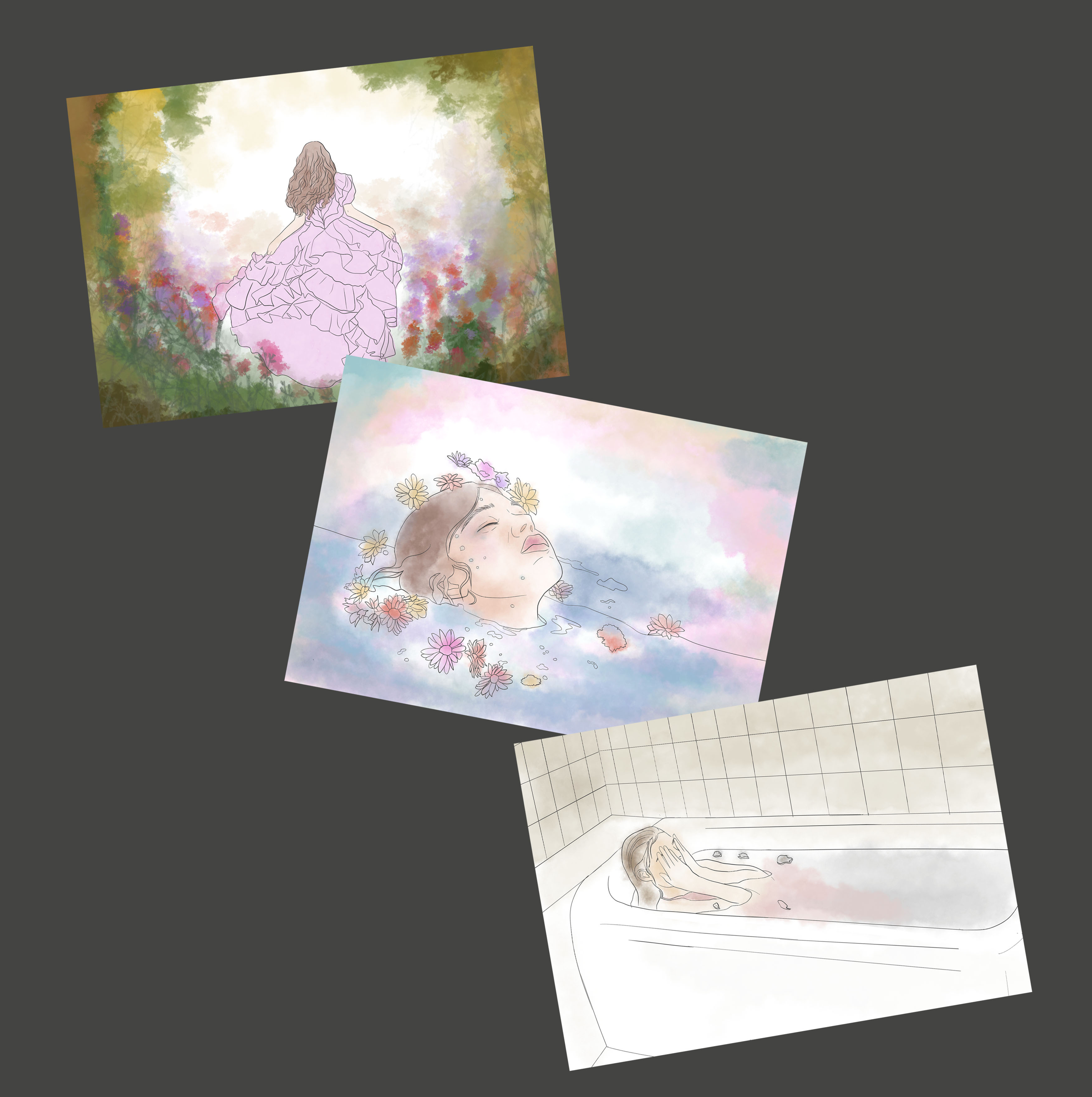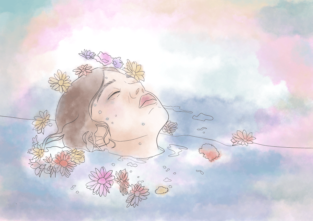The woman lies down on a bed of flowers and grass. Water suddenly overflows from the bed of field, signifying calmness growing to emotional catharsis.