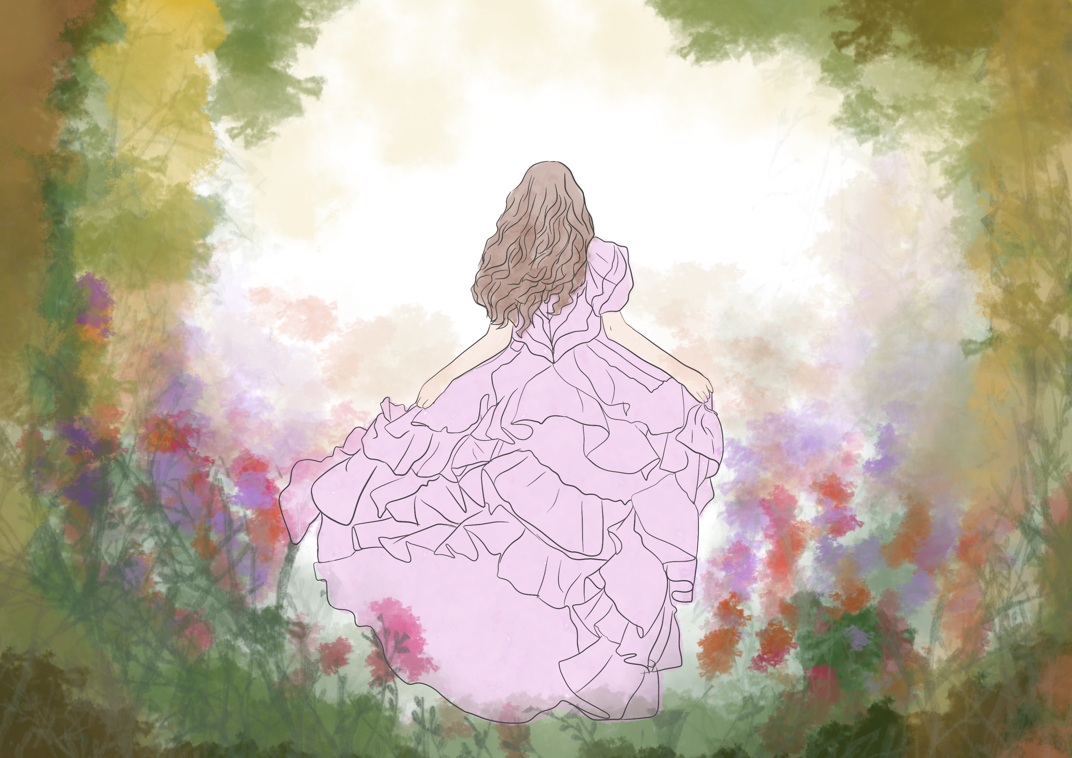 Key Visuals: Bright clearing, flowers, flowing dress, soft pastels.