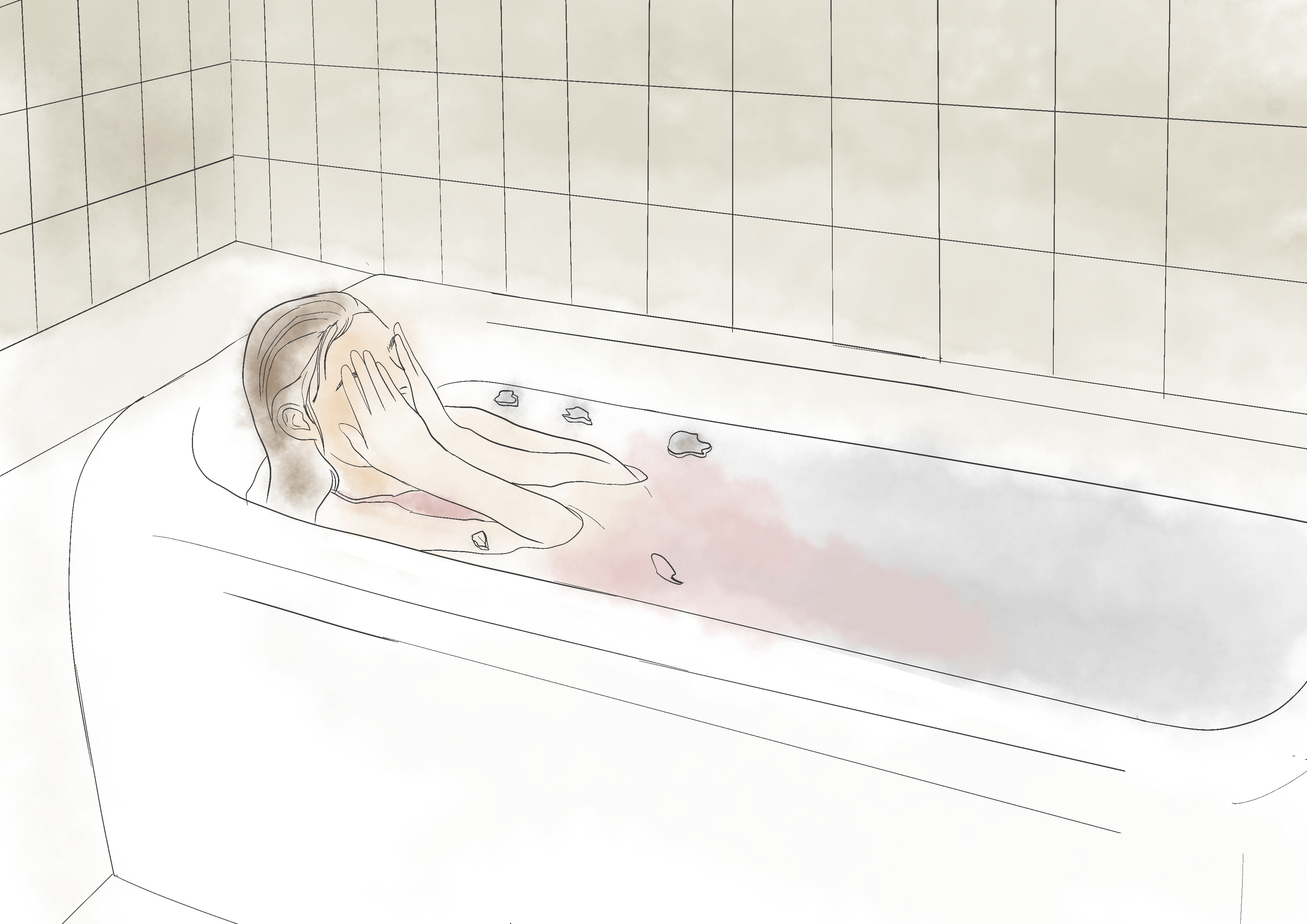 Key Visuals: Bathtub, crying, debris, muted colors, solitude.